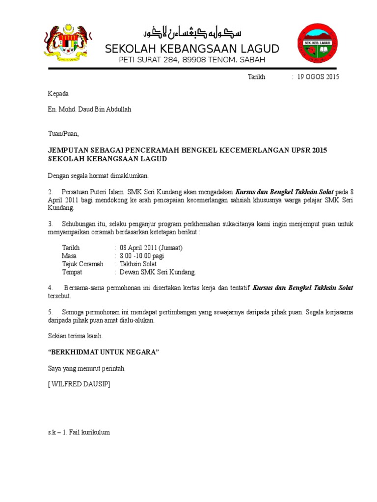 Contoh Surat Rasmi Jemputan Sebagai Penceramah - Contoh Karo