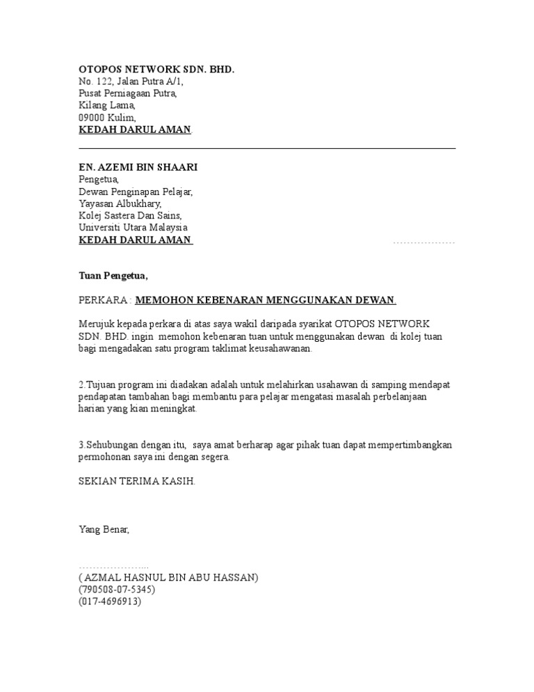 contoh surat rayuan (Aiden Watkins) Adapun surat permohonan sendiri ada yang bersifat resmi atau pun sebaliknya tidak resmi. Documents Similar To Surat Rasmi(Permohonan Penggunaan Dewan). Berikut dikongsikan contoh surat kiriman rasmi beserta format buat panduan mereka yang memerlukannya termasuk ibu bapa dan pelajar.