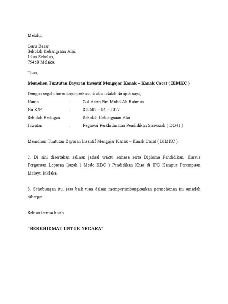 Surat Permohonan Elaun Pendidikan Khas. Misalnya, kita tidak dapat mengerjakan tugas sendiri. suratresmi » Surat Permohonan » Contoh Surat Permohonan Pindah Tugas.