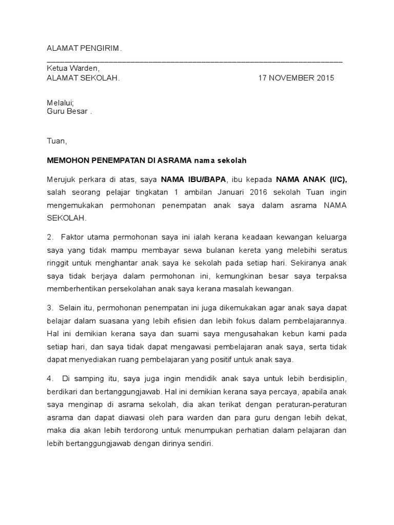 Surat Rasmi Rayuan Masuk Asrama. Baca Surat Asy Syams lengkap dengan bacaan arab, latin & terjemah Indonesia. Seterusnya, apabila tinggal di asrama saya dapat melatih diri saya untuk lebih berdikari disamping saya dapat bekerjasama dengan rakan yang lain dalam menyiapkan.